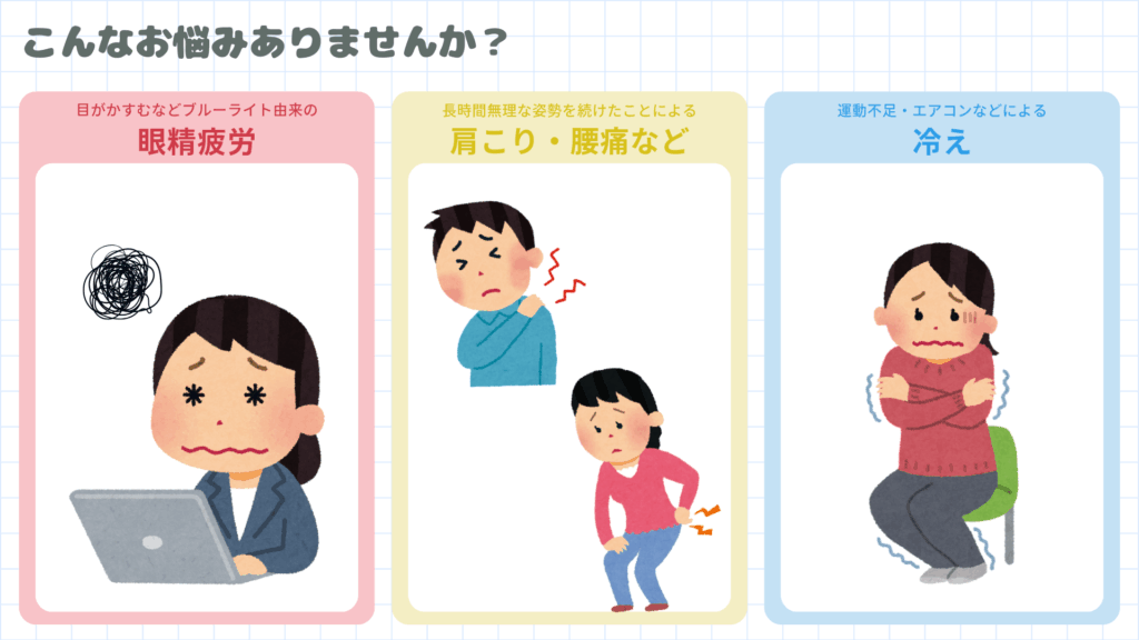 長時間同じ姿勢・体に負担のかかる姿勢だったり、知らぬ間に眼を酷使していたり…