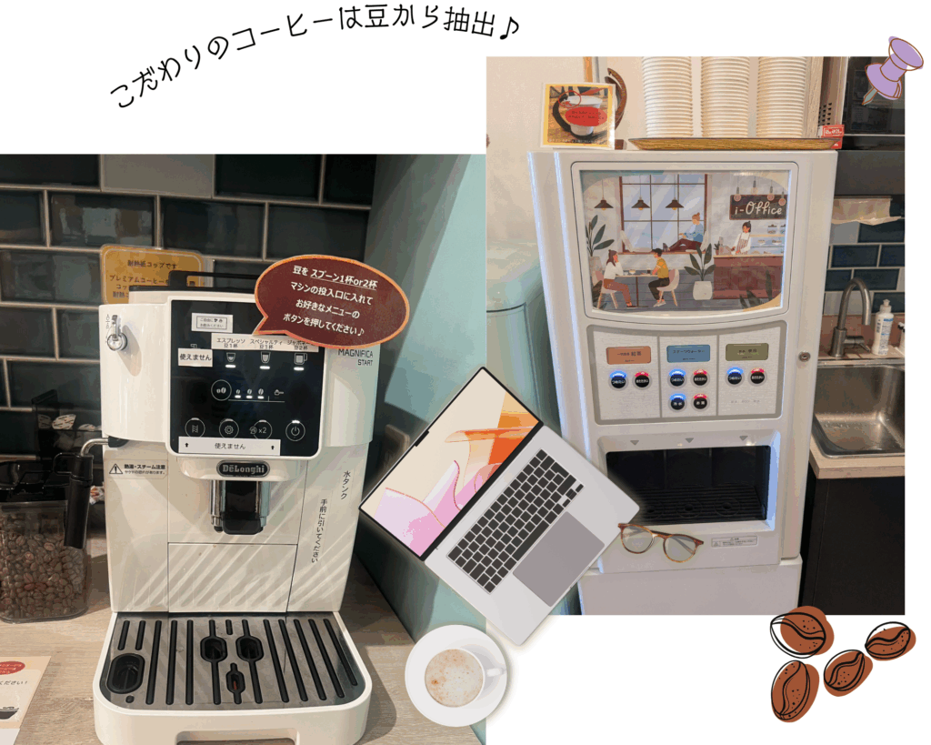 フリードリンクは料金に含まれています。コーヒーは豆からこだわり、習志野市内のカフェや自家焙煎のものを仕入れ、マシンで一杯ずつ挽き立てをお楽しみいただけます。ドリンクコーナーには給茶機・電子レンジ・冷蔵庫もございます。