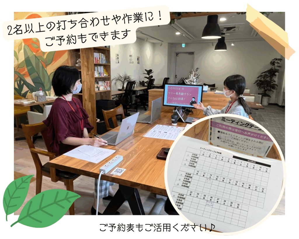 電話対応やWEBミーティングが多いテレワークの方も安心。2~4人で使える大きなミーティングテーブルもコワーキングスペース内にあり、打ち合わせや来客対応にご利用いただけます。月額会員の方は特典として、ゲスト2名まで一時間無料で利用可能!